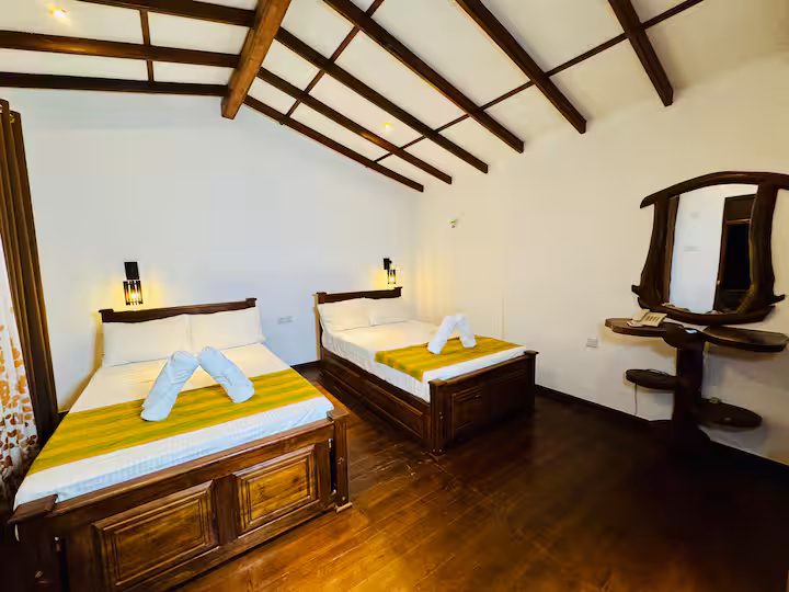Our Deluxe Family Room offers a spacious 72 m² area designed to provide comfort, convenience, and relaxation for families or group travelers. Featuring two large double beds, this room is perfect for guests who need extra space and a peaceful environment.
